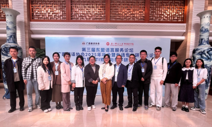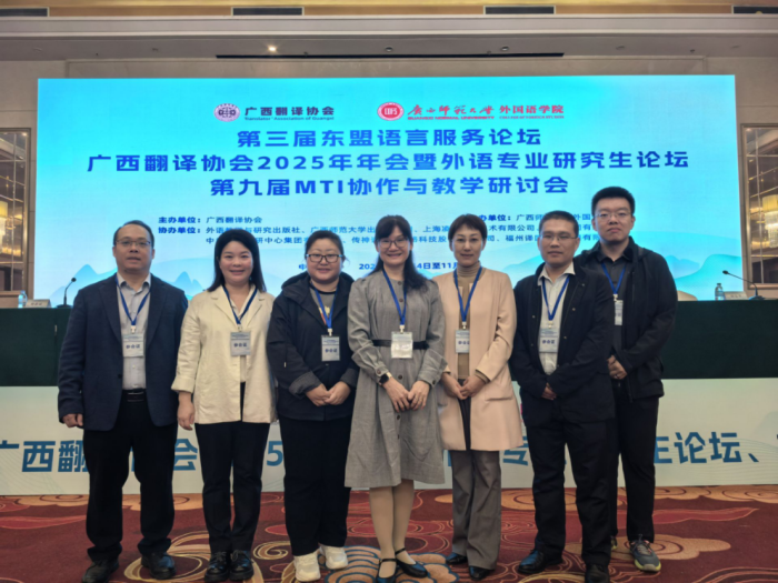 2025年11月14日-16日,由广西翻译协会主办、广西师范大学承办的第三届东盟语言服务论坛、广西翻译协会2025年年会暨外语专业研究生论坛、第九届MTI协作与教学研讨会在桂林召开,全国多所高校及行业企业的300余位专家学者、翻译界同仁和高校师生参加会议。学院曹治柳经理和蓝岚、张莉、李丹、向课书、张飞、门昕煜等7位教师及8名MTI专业研究生参加了此次学术盛会。